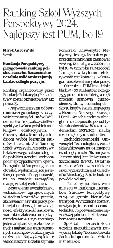 Ranking Szkół Wyższych Perspektywy 2024. Najlepszy jest PUM, bo 19